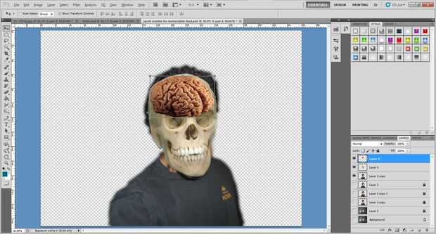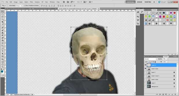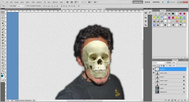 2. en la parte superior de photoshop, haga clic en Editar -> Transformar -> urdimbre. Deformación del cráneo a lo mejor de su estimación de que podría ser el cráneo real. Ayuda a bajar la opacidad de la capa de su cráneo un poco para que pueda ver la cabeza de los sujetos a través del cráneo.