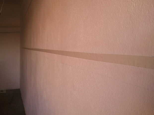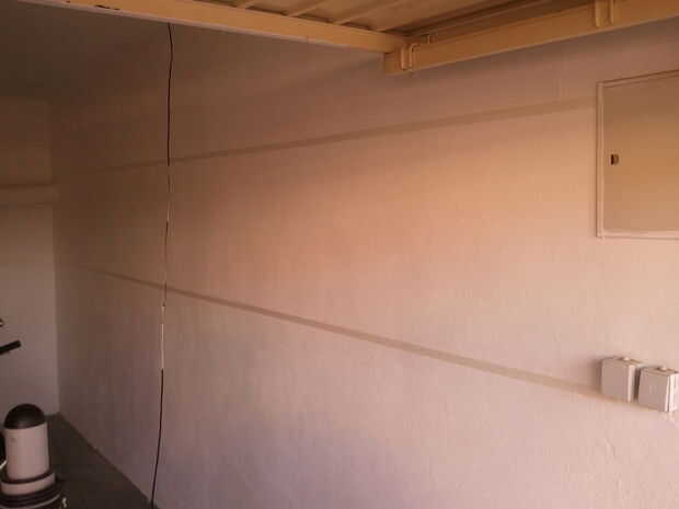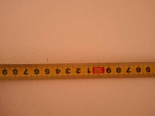 Ahora tienes una bonita pared blanca limpio, la idea es crear una capa horizontal de color amarillo y rojo. Para lograr una agradable línea horizontal marcamos primero la pared con un lápiz y una regla. El banner horizontal que vamos a pintar tiene 70cm de ancho y tiene dos bordes de 5cm en la parte superior y en la parte inferior.