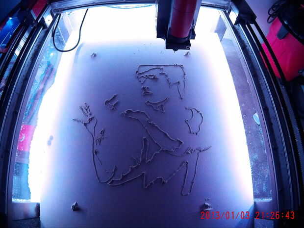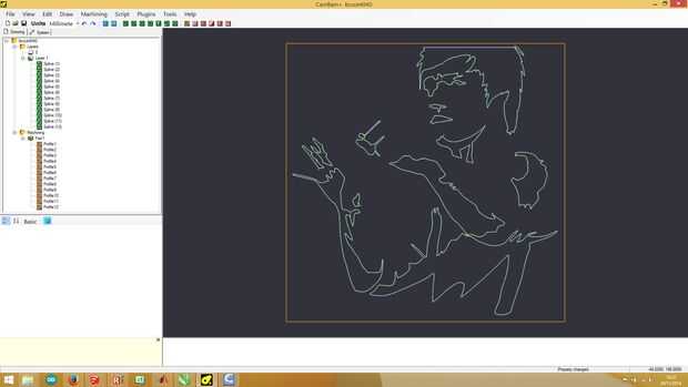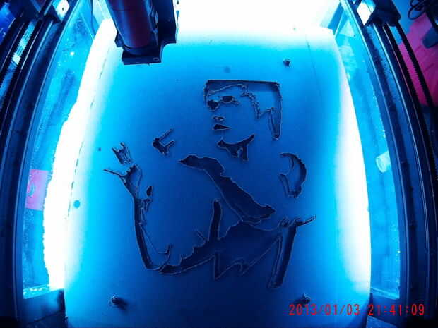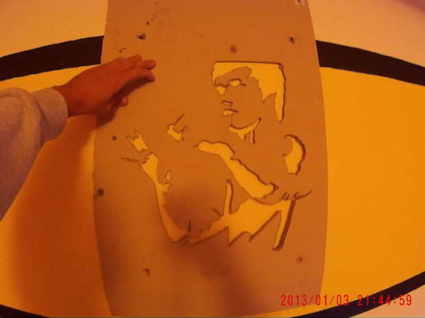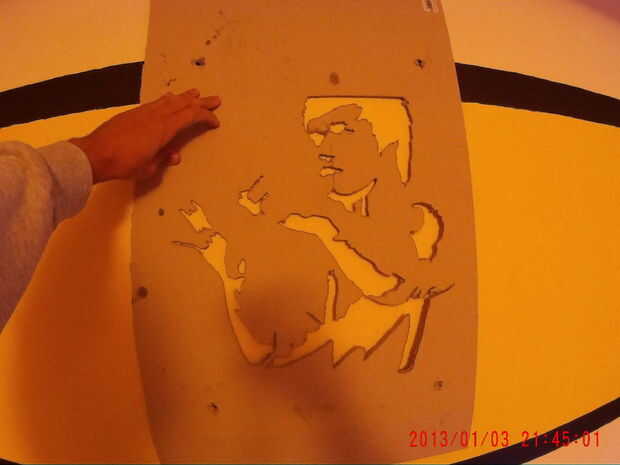 El siguiente paso es realmente pintar arte de Bruce Lee en la pared. Para ello utilicé Buildersbot CNC para cortar un cartón de 3 mm. También puede realizar este paso con un grabador del laser o incluso a mano (si usted hace un gran papel de impresión de la imagen en formato A1 y cortar las piezas negro usando una cuchilla de afeitar).