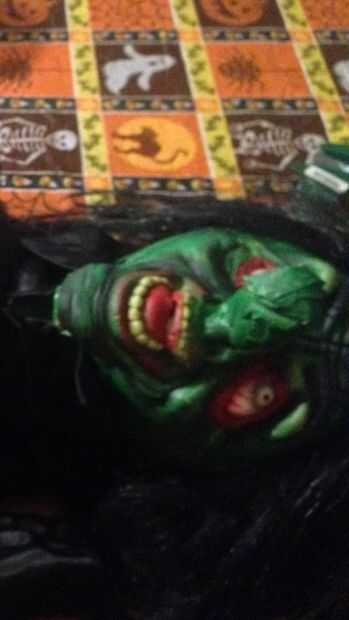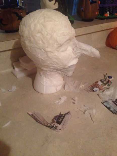 La cabeza de espuma de poliestireno, rollo de periódico un poco añadir un barbilla y nariz, mezclar un poco de pegamento y agua en un recipiente, mojar toallas de papel por toda la cara, tomando su tiempo para desarrollar el área de los ojos, nariz, barbilla, lunares, detalle es clave!!!! Cuando su jugada preparada en la pintura, pintura acrílica verde y roja (alrededor de los ojos) y marcador negro para dibujar algunos detalles extras, para los ojos era de un calvario que he pensado en dejarlas en blanco... (creepyyyyyy) pero no parece acabado, luego he añadido algunas de esas bolas de golf ojo el plástico unos y no guste a todos!!!!!! por lo que es todo prueba y error chicos finalmente, he encontrado globos oculares blandos en mi Halloween esconder (score) trabajaron!!! Agarrar una peluca vieja caliente pegamento en y pasemos al cuerpo