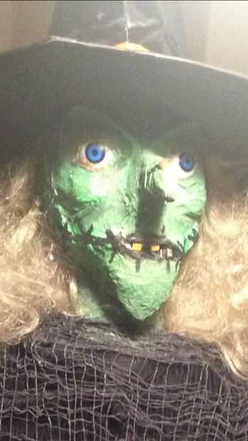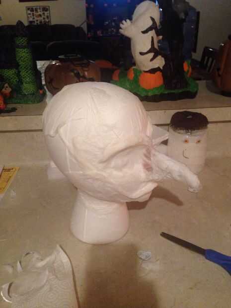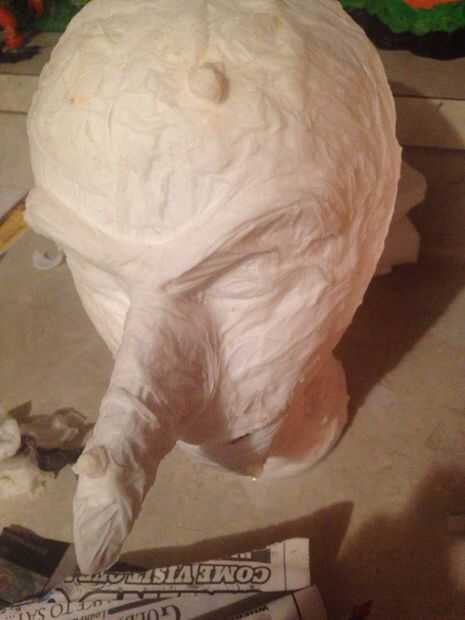 Empezar mezclando un poco de eres tu pegamento y agua junto (papel maché como), ahora Inicio tomando pedazos de toallas de papel para comenzar a definir su forma de la cara, pómulos, lunares, ser creativo hacer toneladas y toneladas de capas para esculpir los pómulos y zócalos del ojo, un secador de mano a mantener el proceso en movimiento a lo largo de la mano (decidí usar un pequeño periódico para esculpir una nariz larga torcida y un montón de lunares) comencé a pintar inmediatamente que utiliza un verde oliva y una pintura acrílica verde brillante con una esponja vieja, iluminó algunas zonas y añadió unos dientes, decidí añadir los ojos de plástico duros... (no estaba loco por al principio) así que decidí agregar más mezcla de toallas de papel alrededor de los ojos