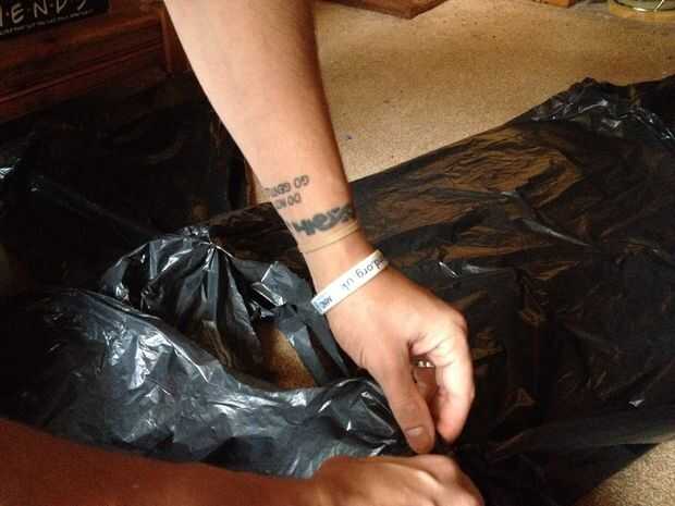 Ponen plano hacia fuera el cuerpo de la capa y colocar las mangas en un extremo con el borde inferior del orificio del brazo alineado con el borde del cuerpo.