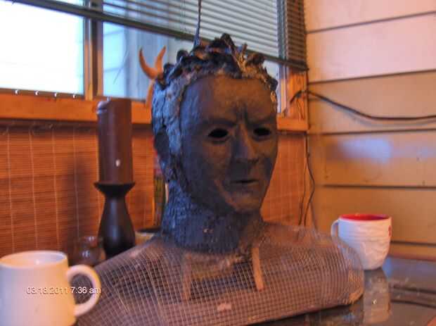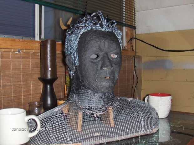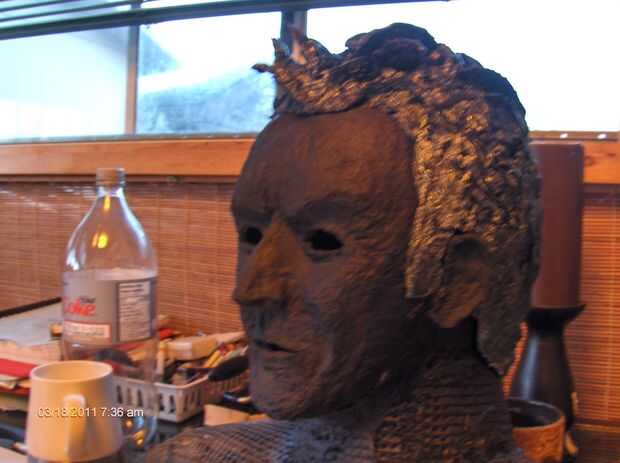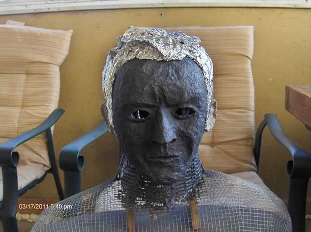 Yo apilados sobre la foto de Charlie Sheen y varios de sus estilos de cabello combinado en uno; eran de todo un poco desordenados de todos modos, no creo que le importa. Lo arrugó encima de papel de aluminio grueso y empezaron caliente pegado a la cabeza. Razonamiento detrás de esto es que yo si iba a ser cubierta con pulpa o fibra de vidrio más. Entonces me llamó la atención, si apretar el papel bastante duro y agregar bastantes pliegues que podía usar simplemente papel de aluminio, reforzado con abundante cantidad de pegamento caliente.