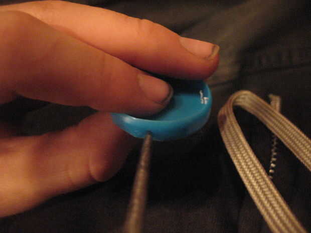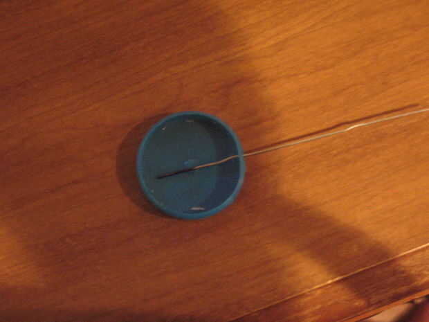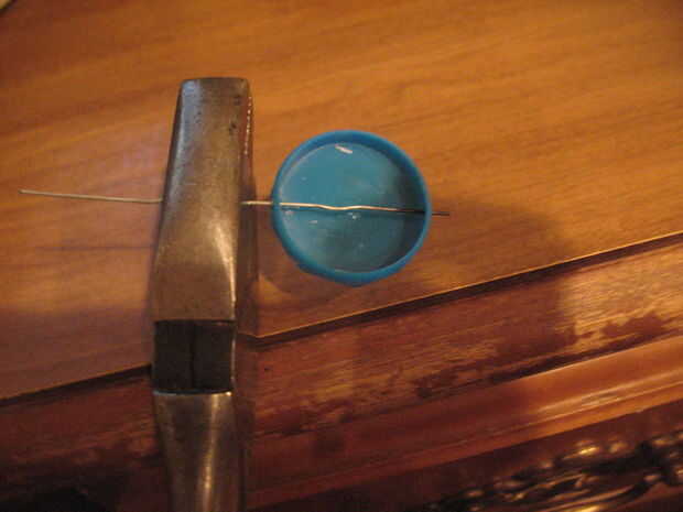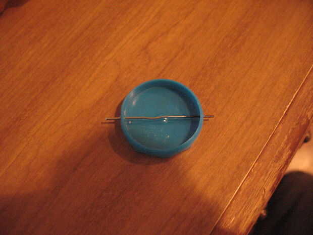 Para insertar el clip de papel, primero debes hacer un agujero con el punzón. Si usas una aguja simplemente pasar con un dedal.  Perforar un agujero de sólo lo suficientemente grande como para que el clip de papel quepa.  Luego dar la vuelta al otro lado y hacer otro agujero.  Una vez que tenga los agujeros empuje el clip a través de hasta de 1/8 de pulgada empuja hacia el otro lado.  Ahora del otro lado utilice el cortador de alambre para cortar el clip de 1/8 de pulgada de lo que queda de la tapa.  Ahora se hace la brújula!  Mezcle en un kit de supervivencia o algo.   Más ' ibles pronto!