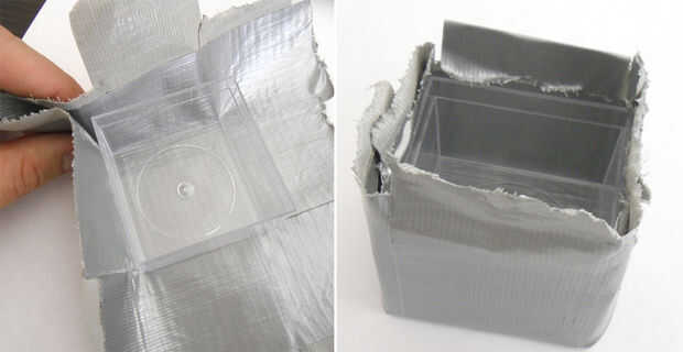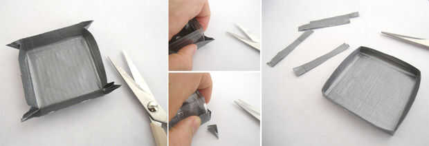 Empezar por doblar cada lado de la almohadilla alrededor de la forma, plegable sobre la superposición a un lado, luego una pequeña cantidad de partes superpuestas de conducto cinta join. Ahora debería tener una una square-ish forma de tazón de fuente con la forma aún en el interior. A continuación, usar un afición sharp cuchillo o tijeras, recortar el recipiente a unos 5mm (1/5").