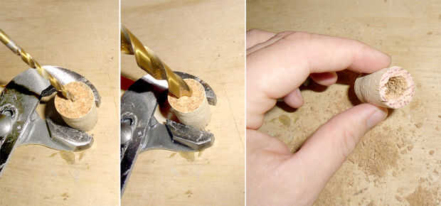 Comience con una pequeña broca de 4mm (5/32") para hacer un agujero piloto y luego mover hasta un poco más grande hasta el diámetro deseado de 9,5 mm (3/8"). Liberando a un poco más grande el corcho frágil es menos probable a desmenuzarse aparte.