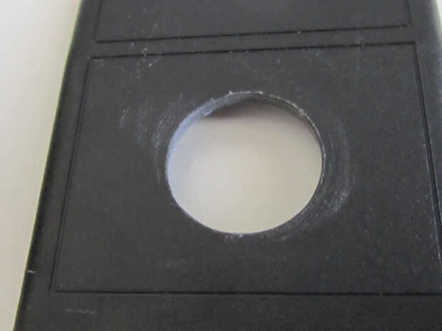 Ahora, ¿qué tal la pantalla? ¿Encaja un objeto cuadrado a través de un agujero redondo? Sí, si el objeto es más pequeño que el agujero. Hice un agujero con una broca de paleta en el centro de la caja (con un trozo de madera debajo de él para la ayuda). Puede hacer el agujero más grande o más pequeño que la pantalla. Si es mayor, entonces cubra los bordes con cinta aislante. Pegué otro pedazo para el lado adhesivo de la cinta aislante para hacer la parte expuesta no pegajosa.