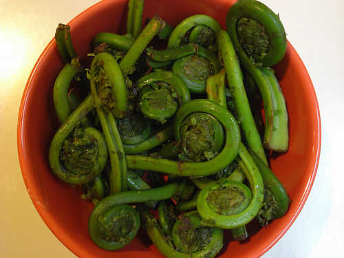 Fiddlehead helechos son las hojas jóvenes, desenrollarse de un helecho. Tienen una luz, sabor espárragos y pueden ser salteados y combina con casi cualquier cosa donde se usaría espárragos.