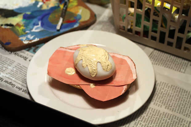 Unos toques de pintura acrílica amarillo proporcionan el toque final a nuestro Benedicto de huevos.