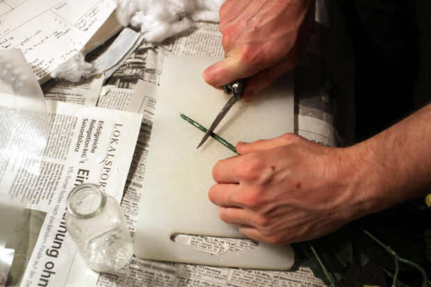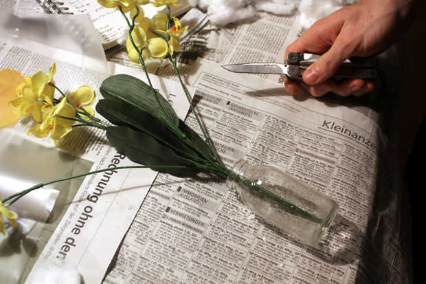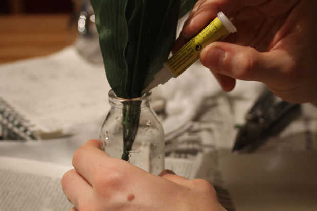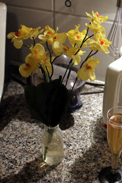 Para acompañamiento floral de esta comida, recortado algunas flores de plástico a la medida y pegados en el lugar en un florero (realmente un vacío IV infusión frasco). Para que nuestras flores artificiales no deshidratan, les dimos agua artificial por medio llenar el vaso con gelatina irradian.