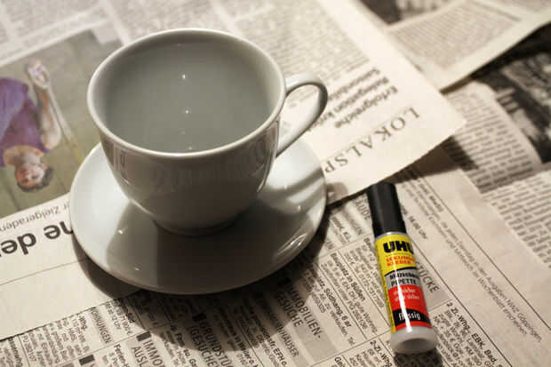 La taza de café fue pegada a un plato y lleno hasta la mitad con gelatina teñida en café.