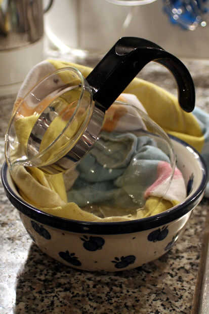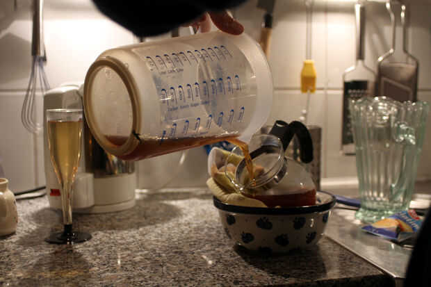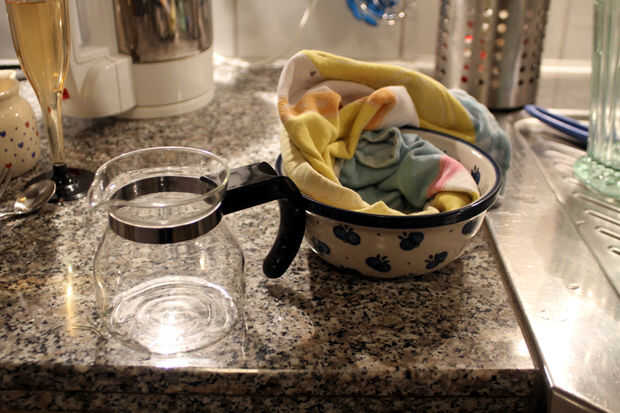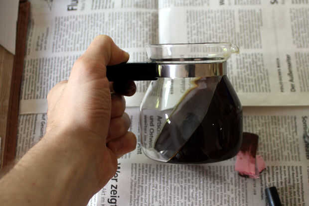 Para el efecto completo de café siendo vertido, era vital que teníamos el café en el ángulo correcto dentro de la jarra. Para lograr esto, había encajada la jarra vacía a unos 45 grados, entonces llenó su boca oscurezca, teñido de café de gelatina.