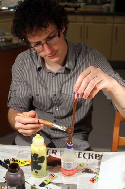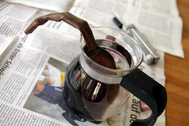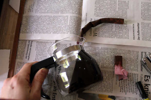 Para hacer una secuencia de diferentes poses de café, pega una tira de cinta alrededor de algunos lazos de torcedura y pintado con pintura acrílica marrón. Esto hizo que un cilindro marrón aplanado rugoso que entonces pega a la boca de la jarra de café.