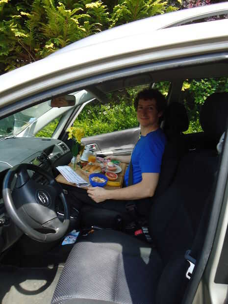 El primer paso de su viaje fue un corto trayecto en coche, durante el cual llevó a cabo la bandeja en su regazo y mantuvo que no a comer a alguno de los alimentos pegados a él.