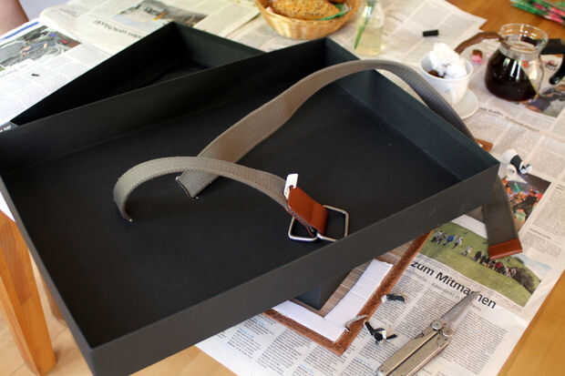 La mayor parte de la bandeja de brunch fue hecha de una caja de cartón de ancha, poco profunda. Esto vino en dos secciones, una de las cuales perfectamente ubicado dentro de la otra. Para hacer la correa de seguridad, pasamos un antiguo cinturón a través de una cara de la sección interna. Nos coloca fuera del centro por lo que puede ser atado a una pierna dejando uno libre para chanchullos de rappel.