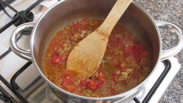 Con la mezcla ahora oro, pelar y cortar 2 tomates y añadir a la humedad, mezclar hasta fry.