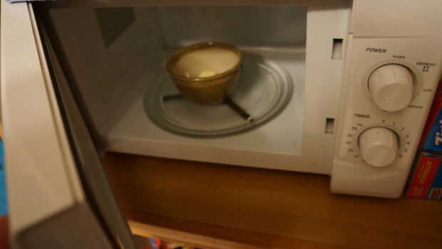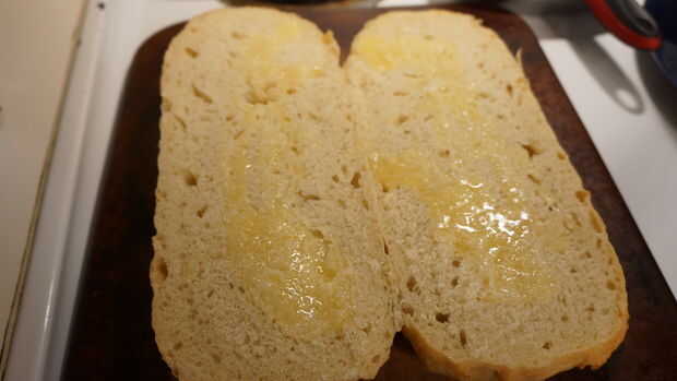 A continuación tomar 2 cucharadas de mantequilla en una cazuela y derretir en el microondas. Desde que estoy usando un pan de ajo clavo de olor no hay para agregar ajo a la mantequilla. Si usted compró a un artesano pan de otra variedad añadir un poco de polvo de ajo a la mantequilla derretida y revuelve en.