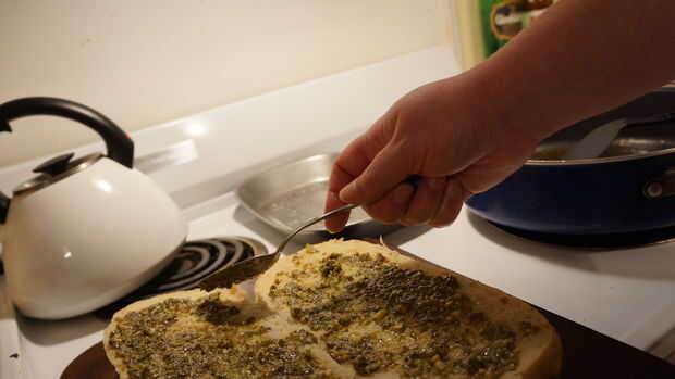 A continuación tomar esta maravillosa creación que es el pesto de albahaca y unte sobre el pan.