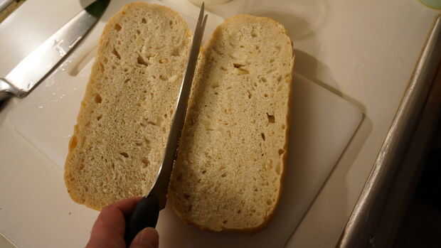 Voy empezar por cortar el pan por la mitad y colocarla sobre la piedra de la hornada / pan. Lo hice mientras tenia las carnes, cocer a fuego lento en cacerola.
