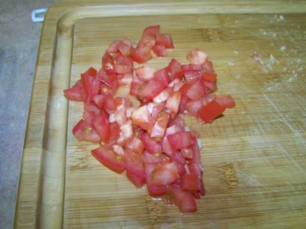 porque vivo en una familia italiana, disfruto muchos alimentos italianos como pizza, espaguetis y albóndigas y cosas como bruschetta.  Esta es una de las recetas de brushetta favorito de mi mamá que ella hace a menudo, y es un gran snack o aperitivo