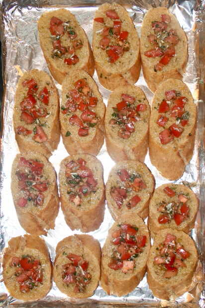 porque vivo en una familia italiana, disfruto muchos alimentos italianos como pizza, espaguetis y albóndigas y cosas como bruschetta.  Esta es una de las recetas de brushetta favorito de mi mamá que ella hace a menudo, y es un gran snack o aperitivo