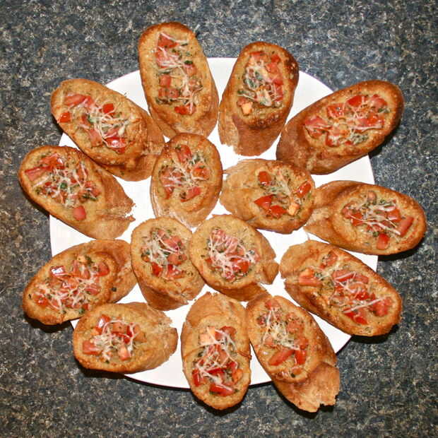 Bomba bárbaro Bruschetta PizzaMi Cheezzy parmesano pan con mi Bomba Bruschetta Mix añadir queso sabroso y pop en el horno y su destino. La Unión de estas dos recetas estaba destinada a suceder. Estoy simplemente feliz que fue hecho estilo bárbaro.Pas