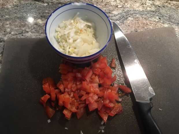 Mientras tanto picar el tomate y la cebolla muy fina. Mezclar algunas hierbas-si fresco picarlos primero.