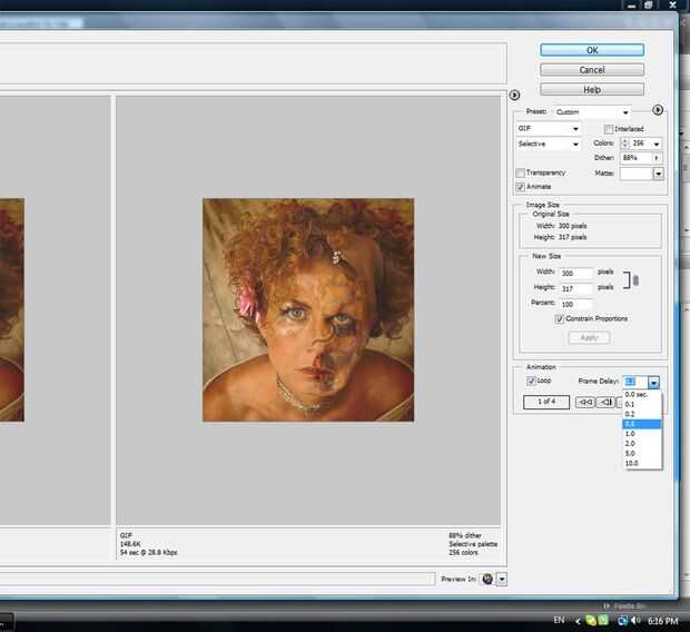 En la parte superior derecha, marque la casilla Animate. En la parte inferior, seleccione la velocidad a la que desea que la animación (seleccioné 0,5 segundos) y marcar la casilla Loop.