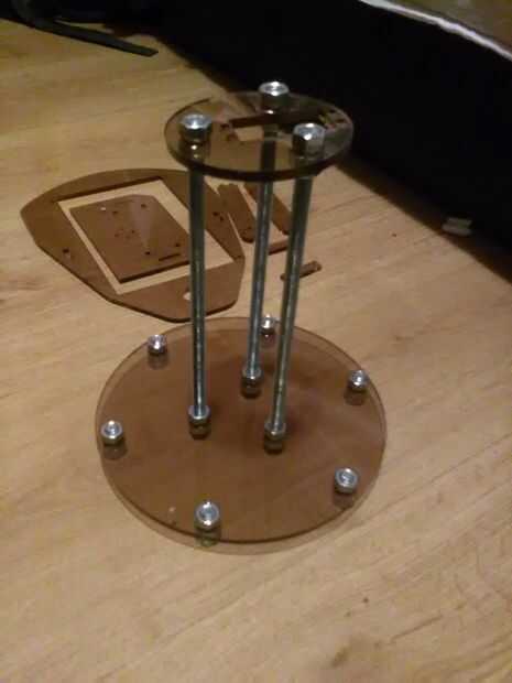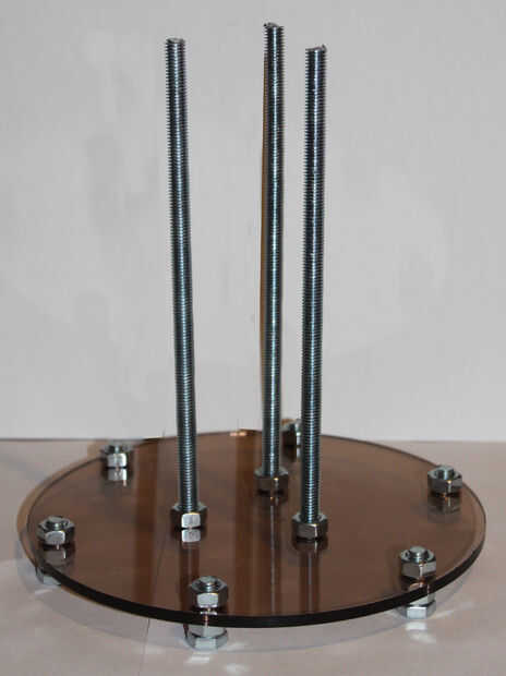 Tomar cañas de 20 cm x 8 mm y poner una tuerca en el extremo de cada uno. Ponerlos en tres agujeros en el centro del círculo de apoyo. Atornille los juntos con otra tuerca. Elemento de lista debe parecerse a la imagen de arriba.