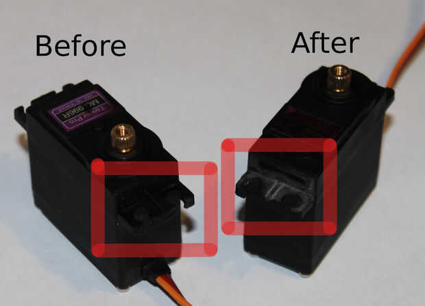Tomar los otros dos servos y moler sus almohadillas de montaje (como en la imagen).