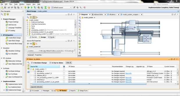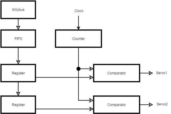 Servo controler se implementó como separado core IP en Vivado. Usamos el lenguaje Verilog. Dos registros almacenan datos sobre la posición del servo. Contador es calculando el tiempo actual. Comparadores de comparar la posición almacenada con el tiempo actual y generan la señal PWM para servos. Cuadros presentan idea general del controlador y pantalla de proyecto real de Vivado.
