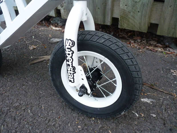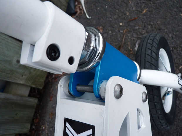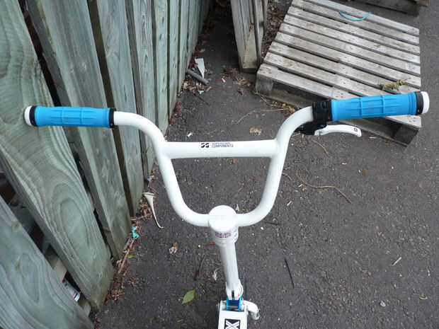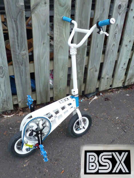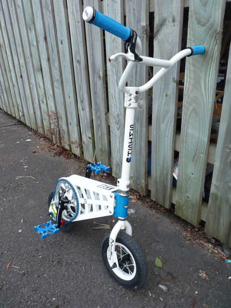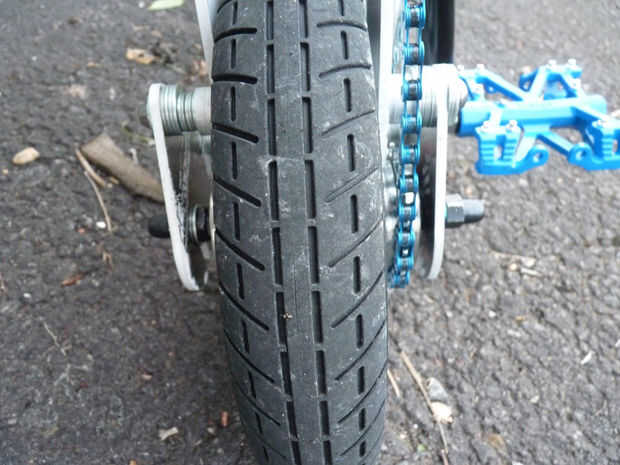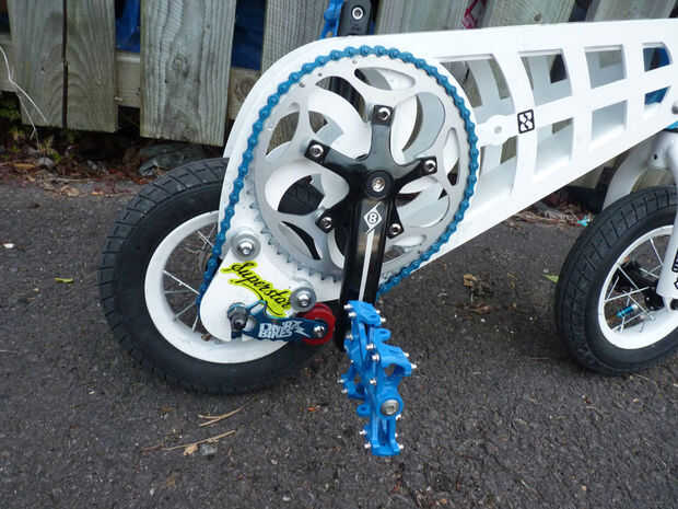 La bicicleta está hecha de una serie de micro scooters desmontadas para el tubo de la cabeza y el cuello, una bici del balance childs de neumático 10" ruedas y horquilla. Bares de BMX y agarres un poco cortan. 140mm bielas con plato de 52T y piñón de 16T. Pedales de magnesio (sí tenía un "dinero ningún objeto" momento!). La estructura es de aluminio hoja diseñada en CAD 2D del corte del laser de 4mm (2 piezas unieron por dos tramos de aluminio caja sección superior e inferior)