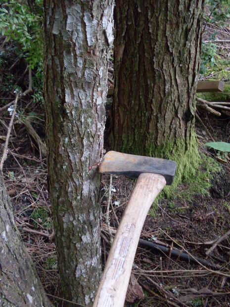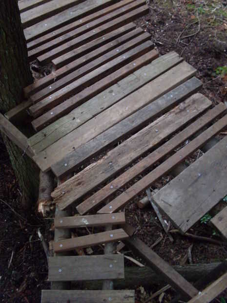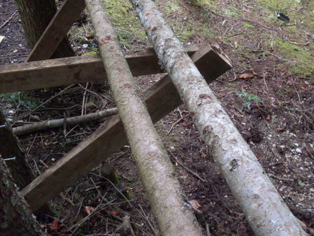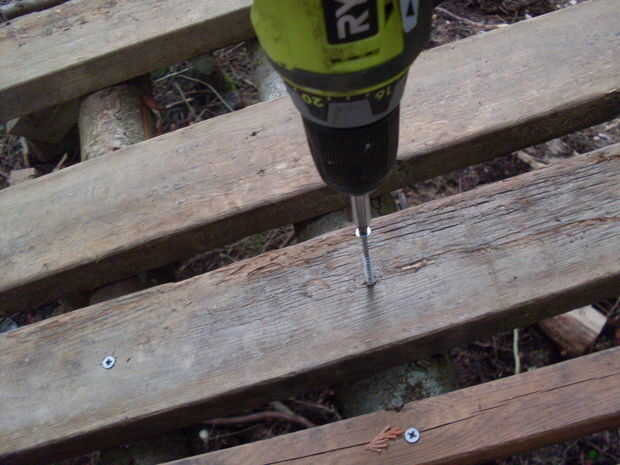 Ahora tome algunos restos de madera, (estoy usando sobre todo 2 x 4 y 2 x 6) y hacer algunos triángulos de soporte y tornillo en árboles cercanos para apoyar el puente. A continuación, puede establecer los árboles que corte antes, atornillarlas y probar un poco para asegurarse de que son lo suficientemente fuertes.