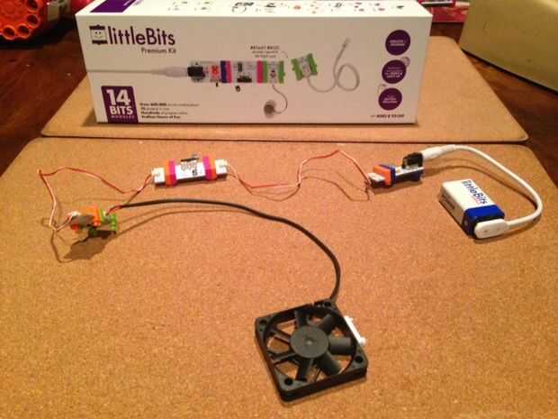 Para hacer la placa de circuito necesita los siguientes módulos littleBits: ventilador, interruptor del rodillo, 2 x cables y la fuente de alimentación. Estos pueden todos encontrar en el kit premium de littleBits.