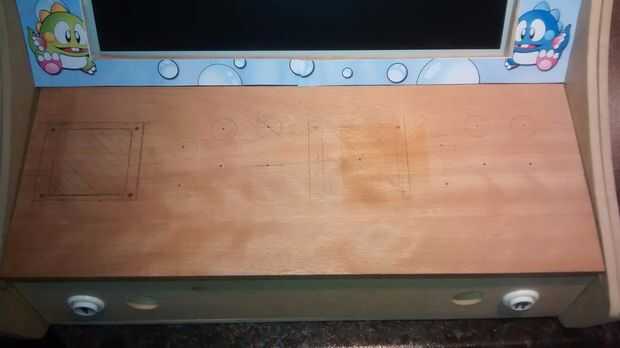 Usando el panel de control impresos he aprovechado esto para la madera y había marcado el centro de cada botón y los joysticks. Luego en la madera sacó el tamaño exacto de cada control.
