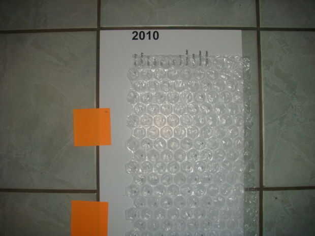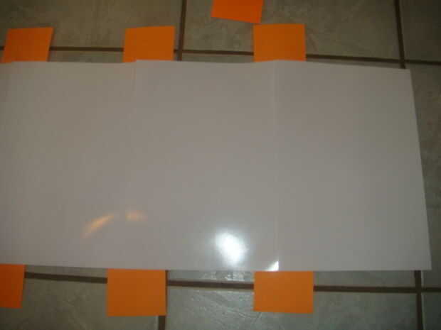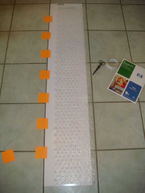 Luego puse el papel hacia fuera sobre un suelo de baldosa para que podría utilizar el borde de las baldosas para hacer una buena recta. Libremente Coloque el abrigo de burbuja sobre el papel y deslice el papel hacia arriba y hacia abajo para conseguir una perfecta alineación completamente hacia abajo. Utilizar algunas notas post-it para unir las páginas mientras trabaja en ellos.