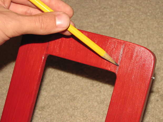 Para comenzar empezaremos escogiendo a un marco. Honestamente el marco que usted elija es totalmente hasta usted. Como se puede ver arriba, tengo una variedad de Marcos y que sin duda todo funcionaría. Opté por usar el marco más amplio, porque pensé que parecía agradable, y un niño le encantaría jugar con él. Este marco es una 4 por marco en 6. (Cualquier otro tamaño funcionará, pero algunas pequeñas variaciones tendrá que hacerse en los siguientes pasos de este instructivo). Este fue sólo un marco madera inacabado que recogí en una tienda de artesanía en algún momento, y luego pinté rojo. Una vez que hayas elegido el marco, marcar una línea donde desea hacer su corte. Dibujar las líneas de corte como se muestra arriba. Después de este corte solo el marco en Herradura como forma. El borde de la arena suave y vuelva a pintar las esquinas donde se corta el marco. Ahora que ya tienes el marco general de corte, puede comenzar a añadir en los clips!