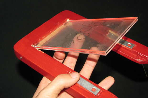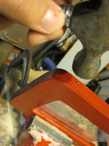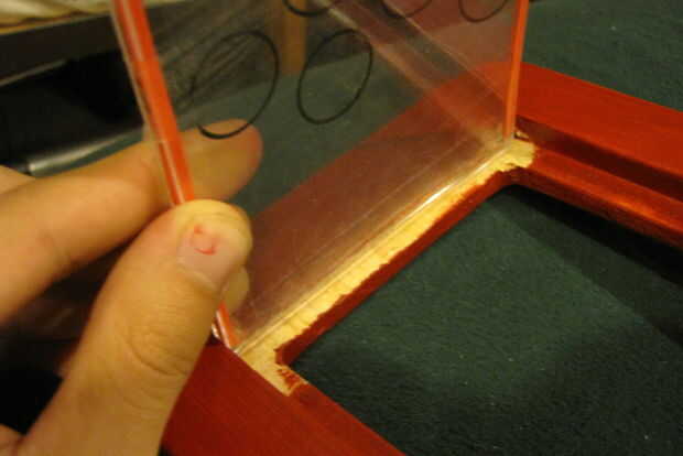 Ahora es el momento para fijar los marcos juntos. En el caso del plástico de la foto podrás ver que hay un pequeño espacio a lo largo de la parte inferior. Encontrar clavos que son el diámetro correcto, así que sin problemas puede torcer el caso plástico alrededor de la uña. Dos de estos clavos se utilizará como la bisagra en el dispositivo de la flashcard. Colocar el caso plástico de la foto en el marco de fotos madera le dará una idea bastante buena que le gustaría esta bisagra que (véase los cuadros). Usando un taladro, hacer un agujero y ambos lados exactamente donde esta la bisagra podrá girar suavemente en este marco de madera. También asegúrese de presionar el taladro recto hacia arriba y hacia abajo. Asegúrese de tomar un momento para pensar sobre donde lo desea colocar la bisagra, y cómo quiere que perfore. Ahora que ya tienes los agujeros perforados, puede utilizar un martillo para golpear ligeramente las uñas en los agujeros. Estos clavos no necesitan ser afilados (puesto que los agujeros se perforan ya) y se ve un poco mejor si los redondos hacia fuera un poco. Toque las uñas en mientras tienes el caso de fotos de plástico en la ranura. Las uñas deben venir hacia abajo en la ranura de la caja de la foto en ambos lados. Una vez hecho esto debe tener una gran bisagra de trabajo para su dispositivo de flashcard! Probar los clips que pusimos un poco antes y hacer ajustes si es necesario. Está acercando!