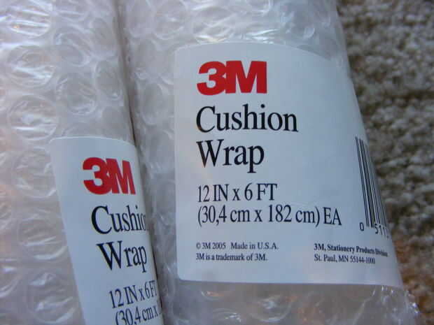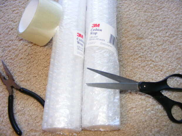 En el cuadro 2 vemos compré cinta transparente y 1 pies por 6 pies rollos de plástico de burbuja de la Dollar Tree, (donde todo es realmente $1,00). Entonces encontré 2 perchas de alambre y desenrollado para hacer un marco para el proyecto.