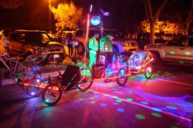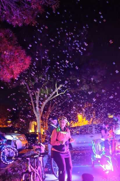 El bubbletrain es un triciclo eléctrico de la remolque dos remolques cargados con 300 libras de material audiovisual incluyendo 16 mono luces, bola de discoteca de luz, tiras de luz LED, proyector de luz láser, máquina de burbujas, 2 altavoces Bluetooth con woofers de 15 pulgadas subwoofer 18 pulgadas potencia 1500 vatios de onda sinusoidal pura inversor, las baterías tres 100 amperios hora SLA (70lbs), battety de litio de 40 amperios hora, controlado desde computador. El bubbletrain se utiliza para ofrecer un espectáculo de luz y sonido para la fiesta de moto mensual de San José. Fotos de Sheldon Hambrick