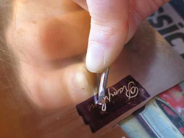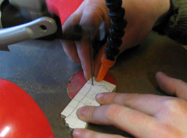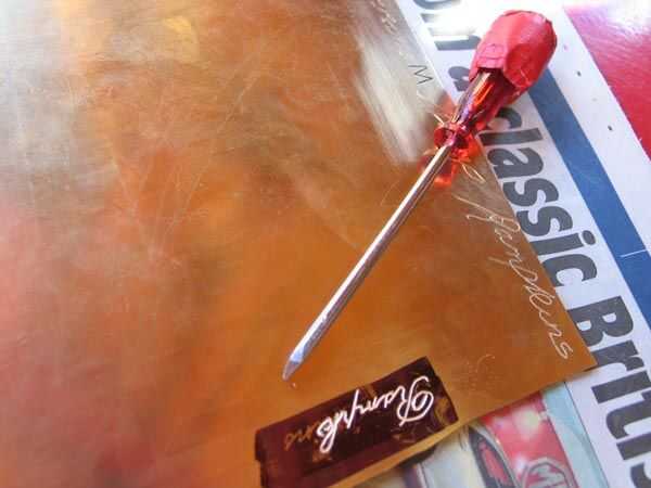Quería incluir una placa de nombre grabado en el teclado pero carecía de herramientas de grabado , así que decidimos hacer nuestra propia de un destornillador de ángulo de pulir y limar a forma. Cuando el grabado era completado, la placa fue cortado de la hoja de cobre amarillo y embutida en un espacio cincelado hacia fuera en el soporte frontal madera.