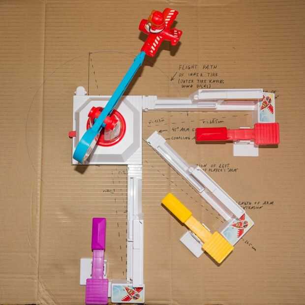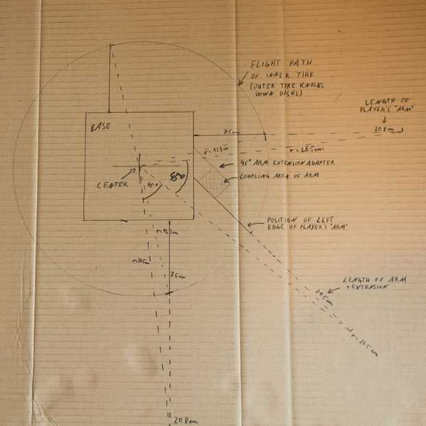Desde allí determiné donde deben quedar exactamente los brazos adicionales para asegurar la máxima distancia de otros brazos. Básicamente una línea que va desde el centro de la parte central hasta la punta de un brazo debe existir cada 45°. El brazo adicional se colocará en esa línea de tal manera que sus discos se obtiene golpeó exactamente en el mismo punto de contacto como los de los brazos regulares.