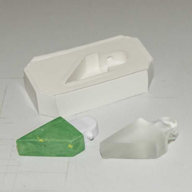 Cuadro #3 muestra mi segundo molde (marco basado en Lego), mi adaptador principal y una copia de resina transparente y coloreada.