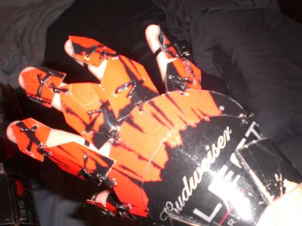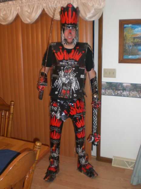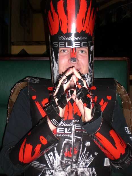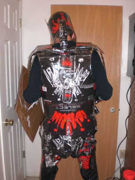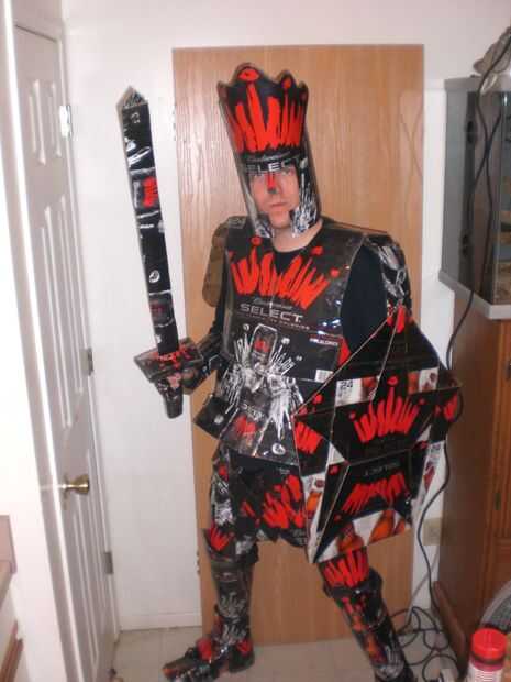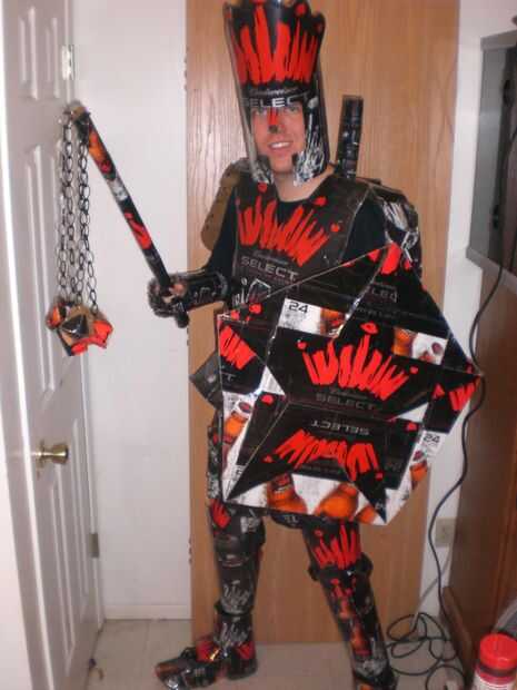 he creado este traje para mi amor de armadura medieval y el alcohol. Comencé por crear el escudo. Había basado en símbolo de la fraternidad, el escudo de la estrella. Es un Pentágono con una estrella en el centro y dos espadas cruzando detrás de él; en mi traje las espadas vienen la parte de atrás y pueden ser utilizadas. En la parte posterior del escudo usé una bolsa para hacer una forma para mi brazo quepa y luego un asimiento de la mano por lo que fácilmente puede caber en mi brazo. Luego comenzó a trabajar en la placa de pecho, en que tomé dos 24 puede cajas les grabado juntos y precedido entonces para cortar las cajas para los agujeros del brazo y así que podría caber comfortablemente. También es cruzada juntas en la parte delantera con Velcro, pero las cajas encajan perfectamente aún formar la corona. El siguiente paso fue cortar formas de diamante en las cajas de cartón para hacer la cota de malla. Una vez cortado, cubrir cada pieza con cinta de embalaje transparente así se protegería la imagen de la parte delantera no estaría nublada. Luego perfora un agujero en las esquinas de cada diamante y utilizar lazos de torcedura para atar cada diamante uno al otro. Hice aproximadamente un pie de longitud y tiempo suficiente para caber alrededor de mi cintura. Para corchete de juntos, usé Velcro negro. Luego hice mi espada que es de las cajas de cartón bud select alrededor una espada ya existente para que pueda ser más fuerte y no doblarse o quebrarse. Puedo poner esta espada en una vaina en la espalda para liberar mi mano si es necesario. Luego usé un 24 puede caso y moldeado en un círculo para caber alrededor de mi cabeza un casco. Para completar el casco, corte la corona roja para poner en la parte superior. Para hacer la batalla hacha tomé una barra de metal larga de una lámpara rota y cubierto con las cajas para hacer el eje de la hacha. Para hacer la cabeza de hacha, tomé una pesada caja de cartón y cortarlo en forma de una cabeza de hacha, que grabó en el eje. Para darle el borde una apariencia más realista, usé las cajas de cartón delgadas en los bordes del hacha para simular un borde. También hice un mayal usando una varilla de bambú de una antorcha tiki, cubierta en finas cajas para hacer el eje. Para la cadena del mayal, coloca lazos zip juntos y corte del exceso para darle un aspecto de la cadena. Para las bolas del mayal, usé pelotas de ping pong y había cubierto con finas cajas que corté una manera para dar una apariencia de puntas en las esquinas de cada uno. Mi armadura de antebrazo es la parte de corona de hielo de las cajas de botellas de 12 pack que formé con un punto en el codo y un borde redondeado en la mano. La armadura se une al antebrazo con Velcro en la parte inferior del brazo. Ambos antebrazos son simétricos uno del otro. Las salidas de armadura de pierna donde la cota de malla termina sobre un pie arriba de la rodilla. La armadura de la pierna es por encima y por debajo de la rodilla y se fija en la parte posterior de la rodilla con Velcro. También creó greaves, usando zapatos New Balance y zip atar pedazos de la cartulina fina al lado de los zapatos. Toda la armadura de la pierna y los chicharrones son simétricos. Los guanteletes son pequeños pedazos de cartón cortado en una caja con un punto y giro atados juntos. Todos juntos mi Bud Select caballero asumió el control cajas de 40 y 70 horas para completar. Todas las piezas que encajan entre sí usan Velcro industrial de la fuerza, y el caballero todo está cubierto en cinta de embalaje transparente para proteger la integridad de la cartulina y lo hace resistente al agua. Este caballero podría hacerse con básicamente cualquier caja de cerveza que viene en latas de pk 24 y 12 botellas de pk.