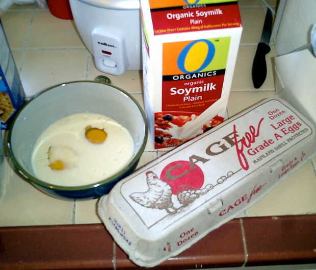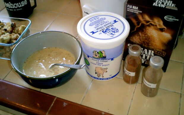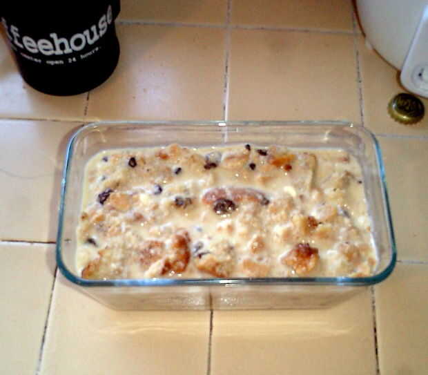 Desmenuce el pan de 1/4 pan de soda irlandés (o cualquier pedacitos de pan tiene alrededor) en una fuente para horno. Añadir otros sabrosos ingredientes secos y mezclar. (En este caso, he añadido un puñado de pasas de Corinto, un poco de azúcar, unas galletas graham desmenuzadas, canela y cardamomo). En un tazón separado, mezclar dos huevos con la leche (o leche de soja) y yogur que usted tendrá suficiente líquido a fondo remoje todas las cosas secas. Batir los huevos, la leche de soja y yogur junto con algún Extracto de vainilla, un poco más de azúcar y especias hasta que sabrosura. Verter los ingredientes líquidos sobre los ingredientes secos en el recipiente. El líquido debe casi-pero-no-absolutamente cubierta de la materia seca. Deje reposar un 10-15 minutos, luego pop en un horno 350F durante 20 a 30 minutos, hasta que se dore la parte superior y una navaja pegada en el centro, éste salga limpio.