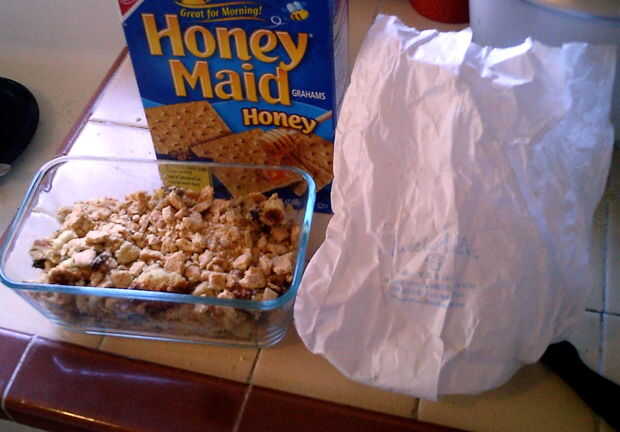 He añadido una capa delgada de cereal dulce desmenuzables bits en la parte superior, sobre todo porque acababa de terminar la caja de cereal y habían sobrado los bits desmenuzables.
