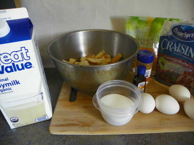 LÓGICA DE ALIMENTOS1) me encanta el chocolate2) no me gusta desperdiciar comida.3) tuve varias tazas digno de cortezas de pan sobrantes de hacer el relleno/salsa con mi madre el fin de semana.Solución: pudín de pan con Chocolate Q.E.D!Paso 1: Reunir