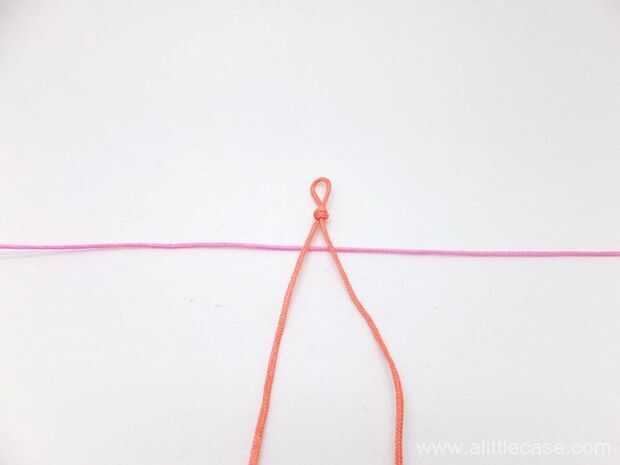 Doble su anuda cuerda de (rosa) por la mitad para encontrar el centro y colocarlo bajo el nudo.