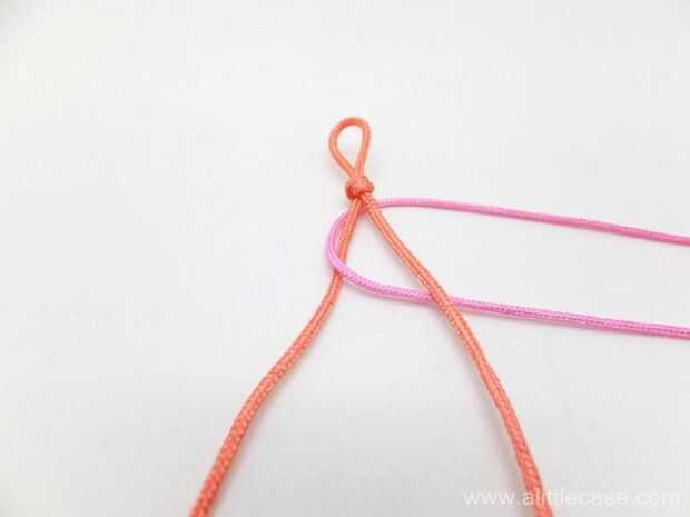 Tomar la izquierda rosa cuerda que anuda y tejer en la hebra izquierda del cable naranja y luego en la cuerda derecha naranja.