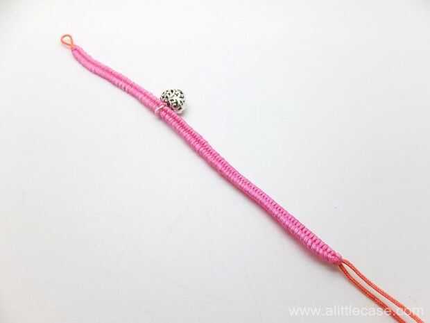 Al llegar al final, atar los dos cabos de cuerda que anuda con un nudo en la parte inferior. Y recortar las cuerdas exceso, quemar la cola de los cables para asegurarse de que la pulsera no se nunca se resbaló.